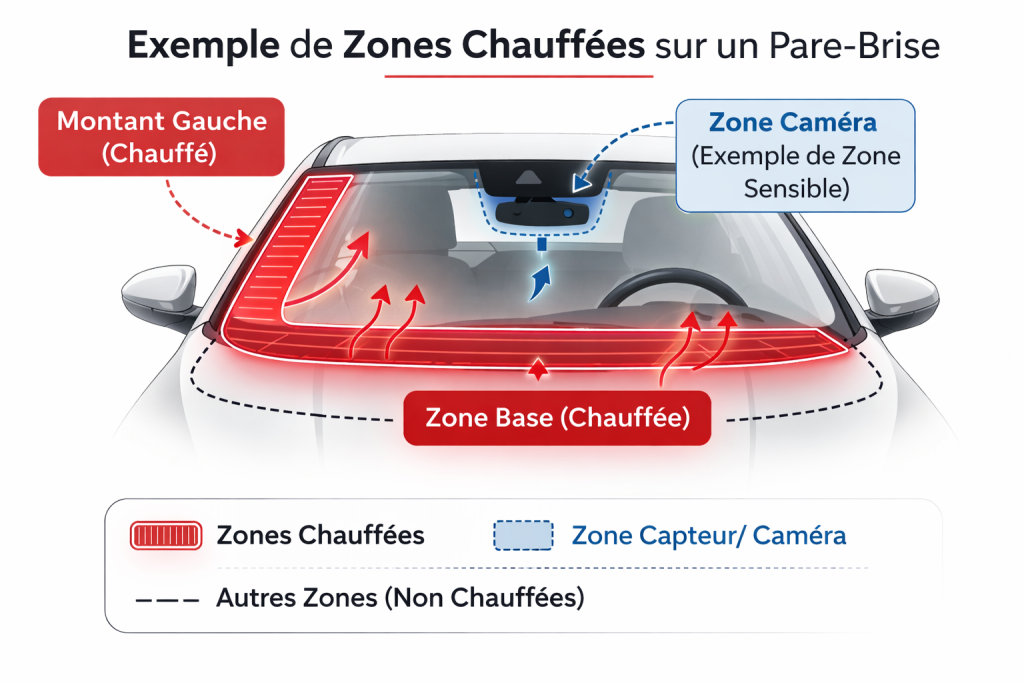 Sur certains véhicules, le pare brise chauffant agit sur des zones précises, comme la base du pare-brise et une partie le long du montant gauche. Cela signifie que le vitrage n’est pas uniforme du point de vue fonctionnel : certaines zones sont directement liées au chauffage.